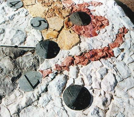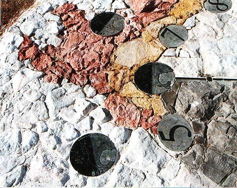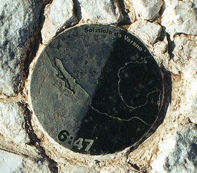 Si al atardecer de los dias del Solsticio de Verano (6:47 p.m.), de los Equinoccios de Primavera y Otoño (6 p.m.) y del Solsticio de Invierno (5:12 p.m.), te colocas de pie sobre la línea correspondiente a cada uno en la escala de fechas, verás que tu sombra se proyecta en dirección de los globos colocados hacia el Este en la hora correspondiente a cada fecha.