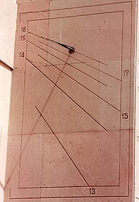 El reloj de Sol de la foto izquierda es ligeramente declinante hacia el Este. Tiene las líneas de las horas con fracciones de cada 15 minutos, el analema alrededor de la línea del mediodía y las líneas de declinación de acuerdo a las constelaciones del zodiaco.