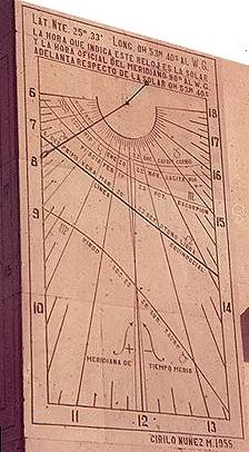 El reloj de Sol de la foto derecha está orientado casi al Poniente. Tiene las líneas de las horas y una pequeña línea para indicar los equinoccios. Estos relojes fueron labrados por el artesano Cirilo Núñez en 1955.