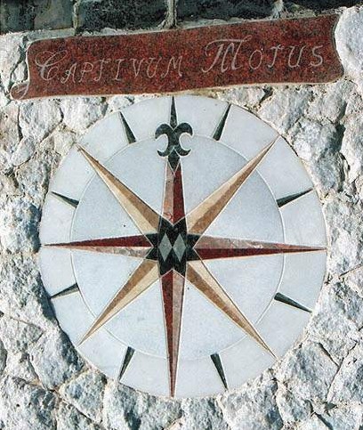 El lema del reloj "Captivum motus", significa "El tiempo capturado". En esta Rosa de los Vientos, las puntas de color rojo indican los puntos cardinales, las de color ocre los laterales y las puntas más pequeñas de color verde los colaterales.
