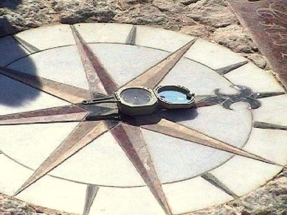La Rosa de los Vientos está situada al Sur del sciaterio analemático. La brújula fue colocada para mostrar los 8 grados de desviación del Norte magnético con relación al Norte geográfico.